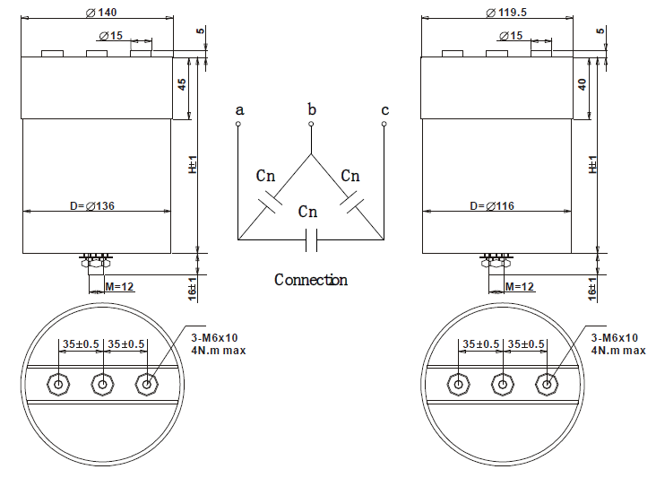 2、电压450VAC;容量3*100--3*200uf,集成三角形接法;